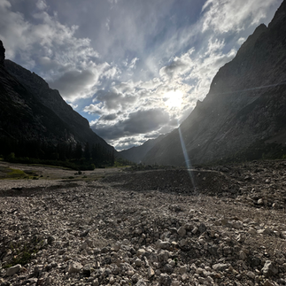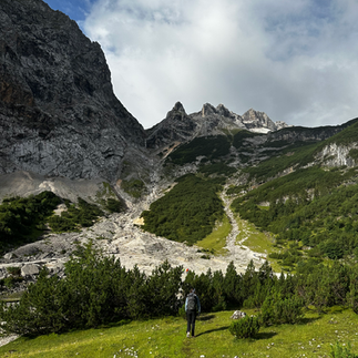 Langsam weicht das Grün der Wälder und Almwiesen nacktem Gestein und dem Grau der Geröllfelder. Das Gelände wird zunehmend alpiner. Nach der Reintalangerhütte geht es immer steiler nach oben. Der bisher angenehm zu laufende Wanderweg wird zu einem Gebirgssteig, der sich über Geröll in Richtung Zugspitzplatt windet.